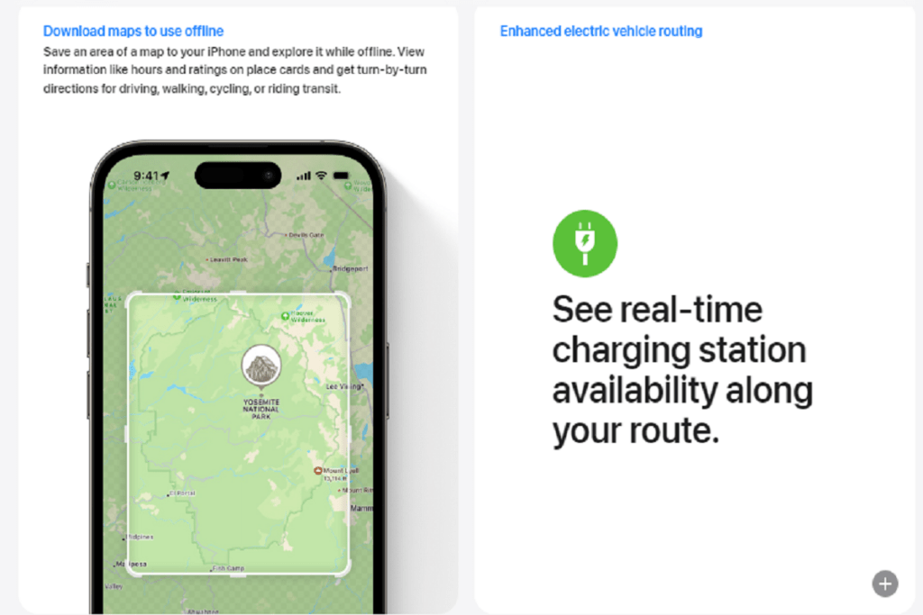 L'entreprise a travaillé à l'amélioration de ses fonctionnalités dans ce domaine et a même lancé une fonctionnalité de routage pour véhicules électriques lors de la WWDC 2020. Grâce à cette fonctionnalité, les utilisateurs peuvent choisir une borne de recharge compatible pour leurs véhicules le long de leur itinéraire. Cette fonctionnalité permet également le suivi. charge actuelle et les facteurs d’altitude ainsi que d’autres conditions.