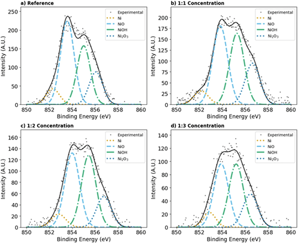 - With 1:1 concentrations, it remains prominent but an increase in Ni and Ni203 contributions was also noticed. This further suggests that there was a reduction in oxidation efficiency.