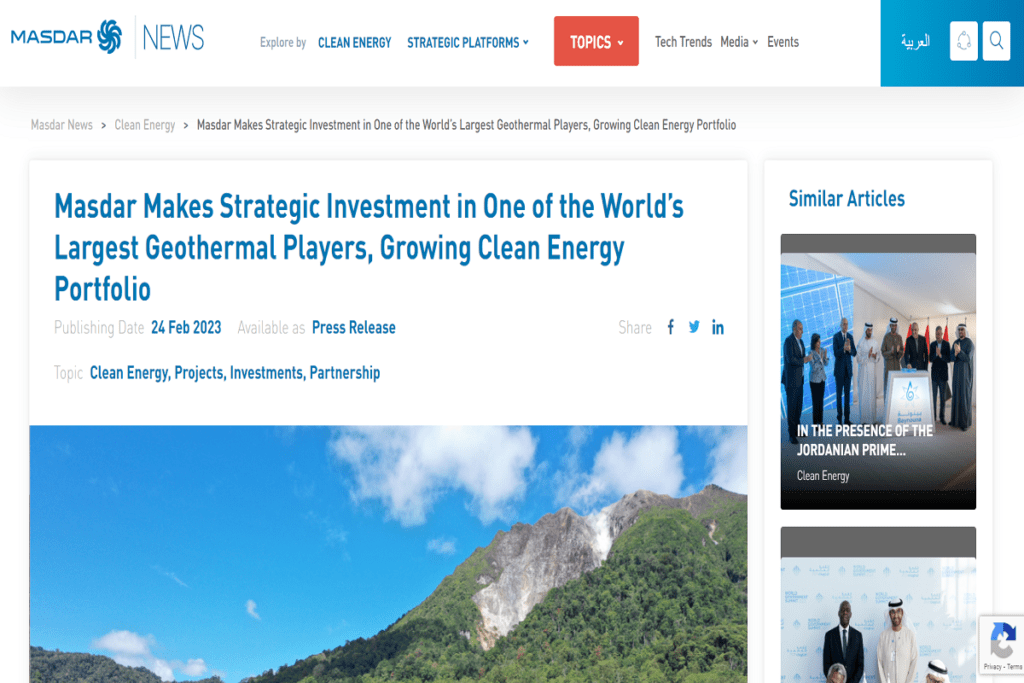 UAE-based investment company to finance its first geothermal project in Southeast Asia by investing in PGE. Yes, Masdar invests in Indonesian geothermal energy company Pertamina.